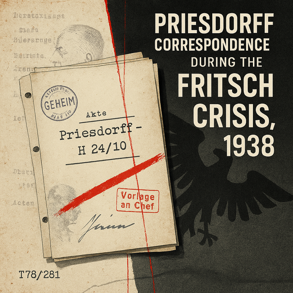 The presence of names, ranks, honours, or positive characterisations of individuals in this correspondence does not imply agreement with, or endorsement of, their actions, political views, or later careers. The material is presented solely as a historical source to document how military historiography and officer biographies were discussed and controlled during the Fritsch crisis of 1937–1938.
